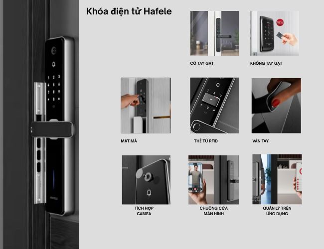 Hình- hệ sinh thái khóa Hafele gồm khóa điện tử, khóa cơ và các nhóm phụ kiện cửa hỗ trợ vận hành.
