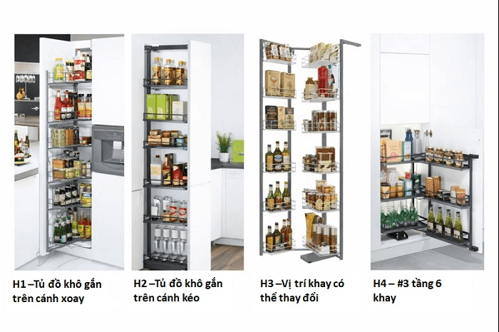 Các nhóm phụ kiện tủ đồ khô theo cách bố trí và nhu cầu sử dụng trong tủ bếp cao