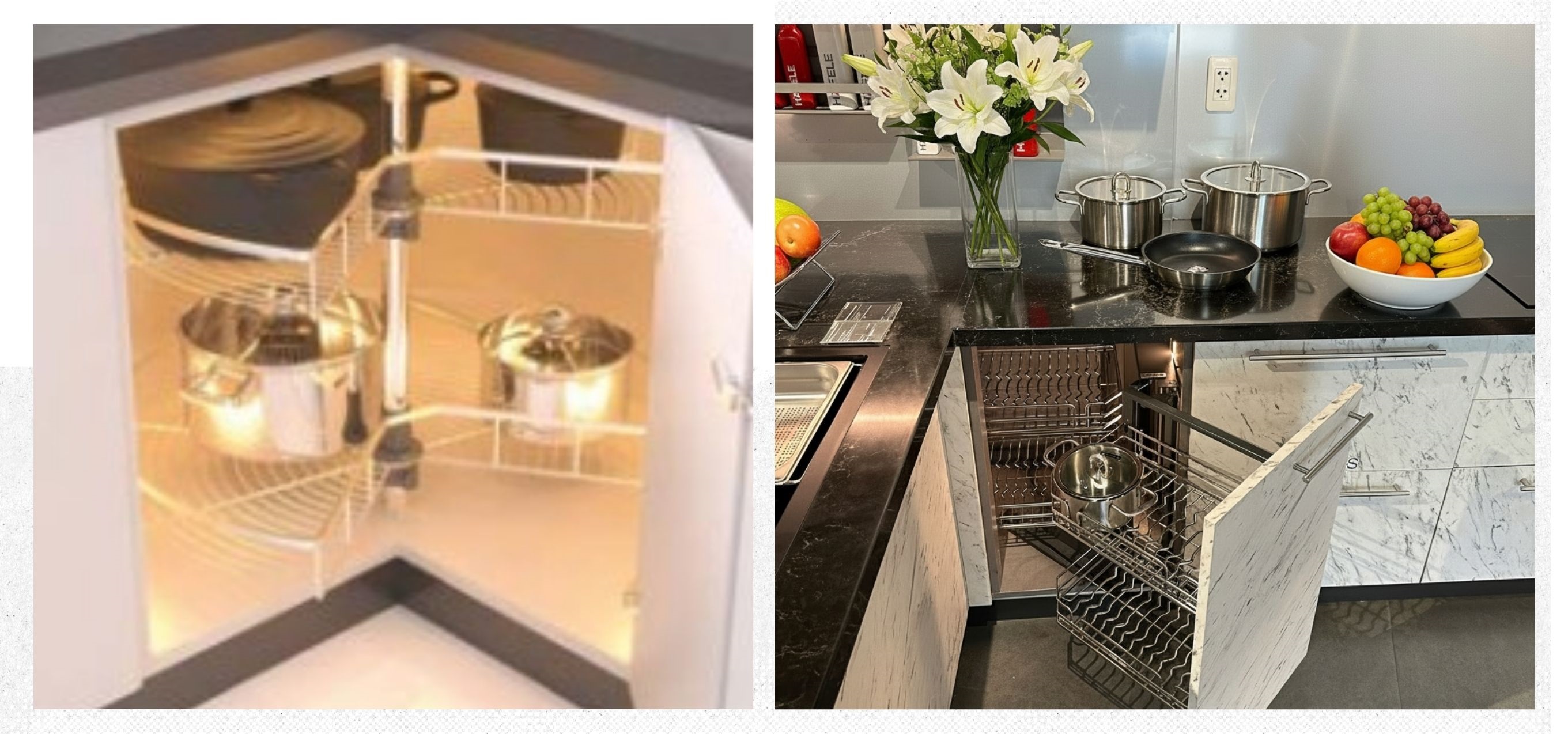 - Khi mở tủ, toàn bộ các rổ chứa di chuyển đồng thời sang trái hoặc phải (tùy thiết kế cửa), đưa phần không gian sâu trong góc ra ngoài tầm thao tác.