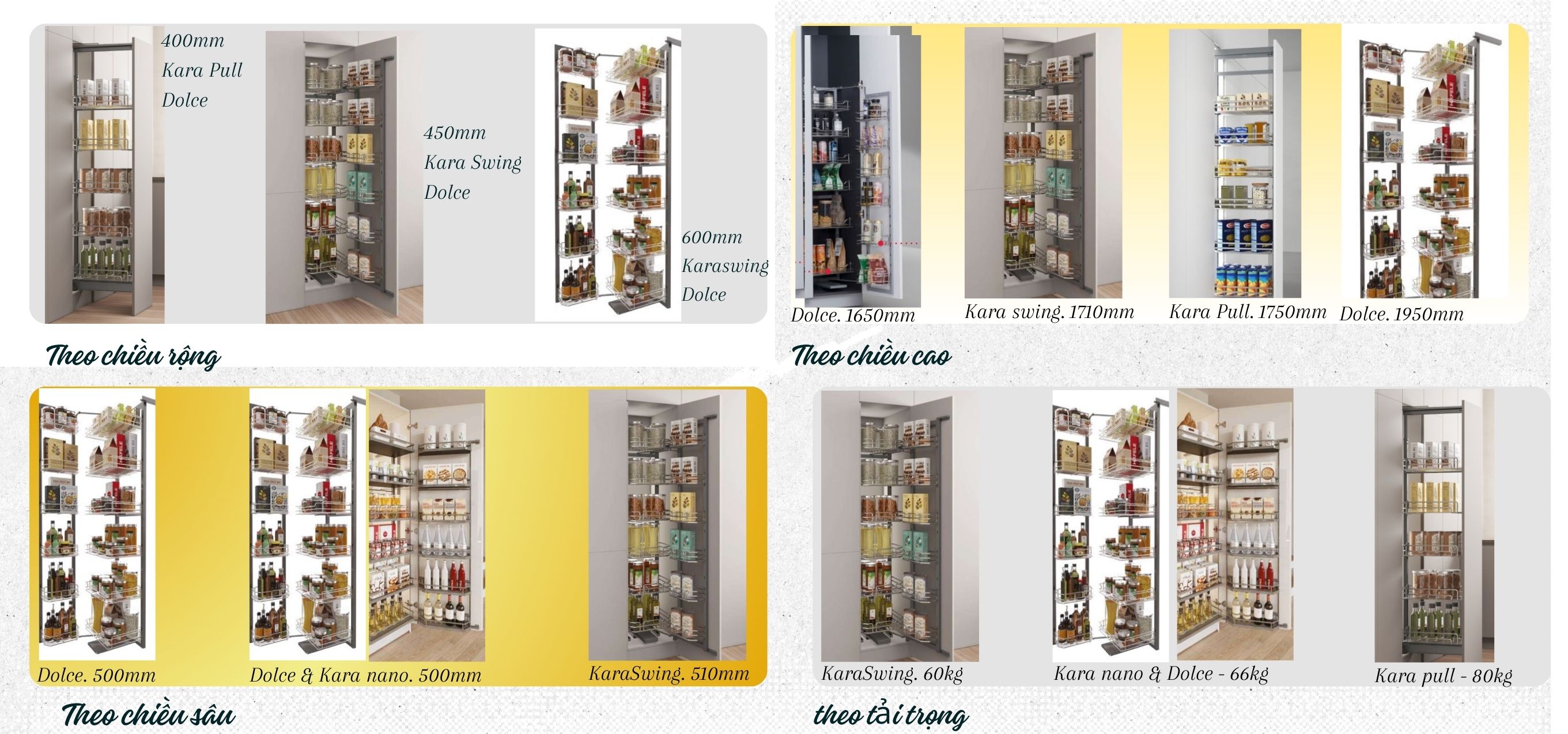 Tủ đồ khô Hafele Kosmo thuộc hệ Tủ đồ khô Hafele, dùng cho khoang tủ cao lưu trữ thực phẩm khô và chai lọ theo chiều đứng. Nếu chọn sai chiều rộng, số tầng hoặc tải trọng, không gian tủ có thể bị hạn chế và thao tác thiếu thuận tiện. Dòng Kosmo gồm Kosmo-C (Dolce) 6 tầng phù hợp tủ cao đến 1950mm và Kosmo-P với Kara Swing, Kara Pull-out sử dụng nan oval inox 304 chịu tải đến 80kg. Xem phần phân loại bên dưới giúp xác định phương án phù hợp trước khi chọn sản phẩm cụ thể.